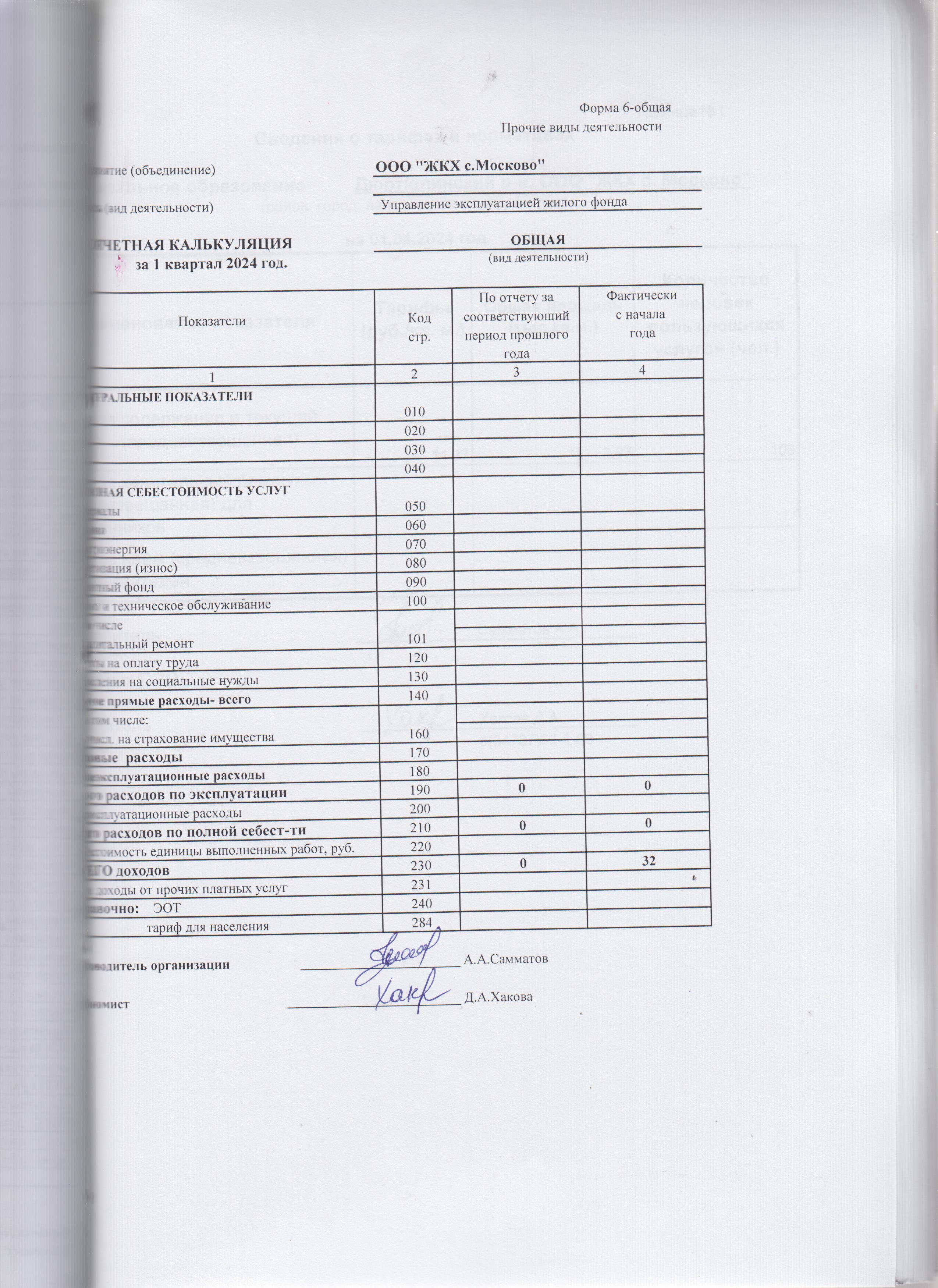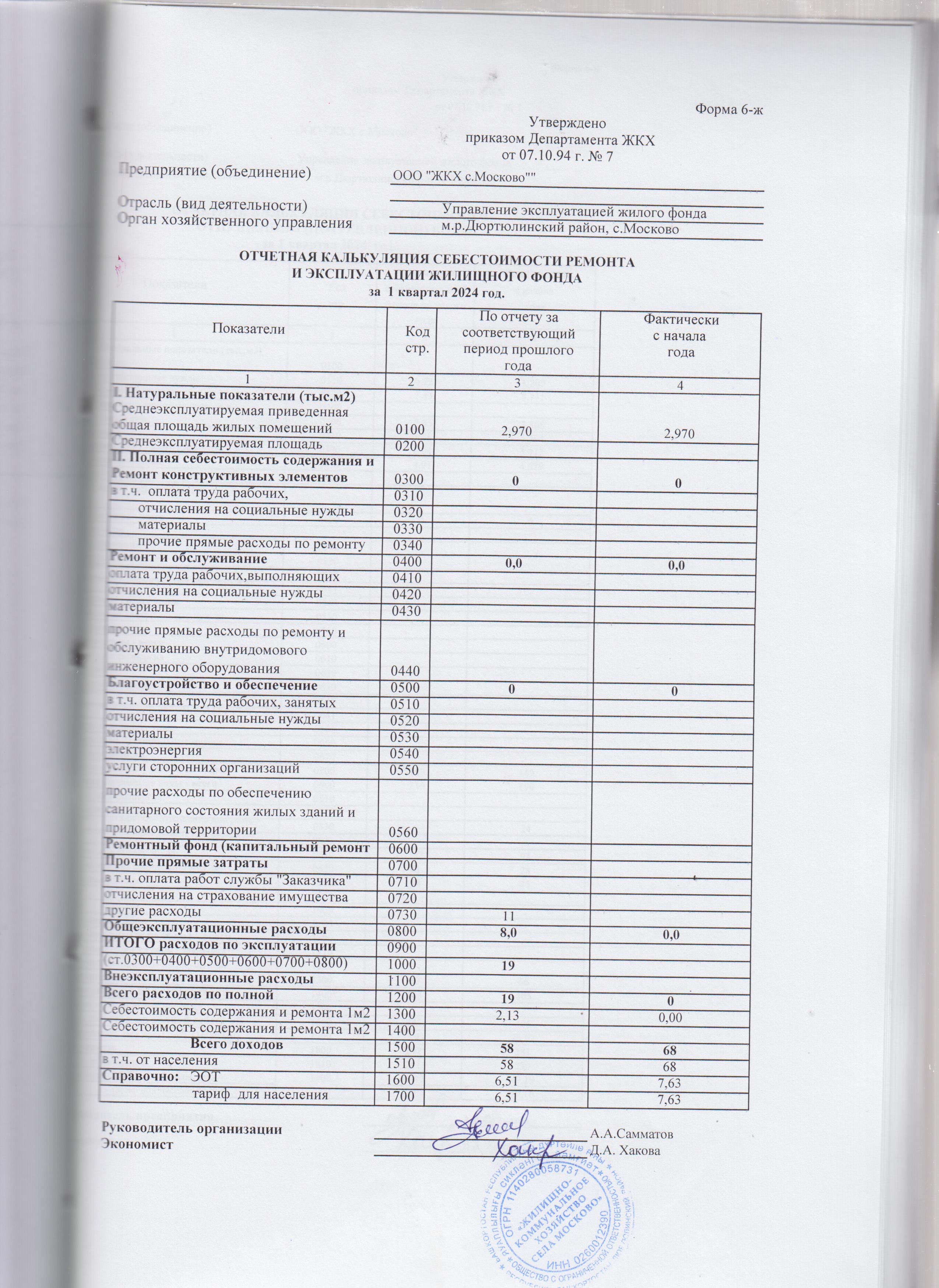 Отчетная калькуляция себестоимости ремонта и эксплуатации жилищного фонда за 1 квартал