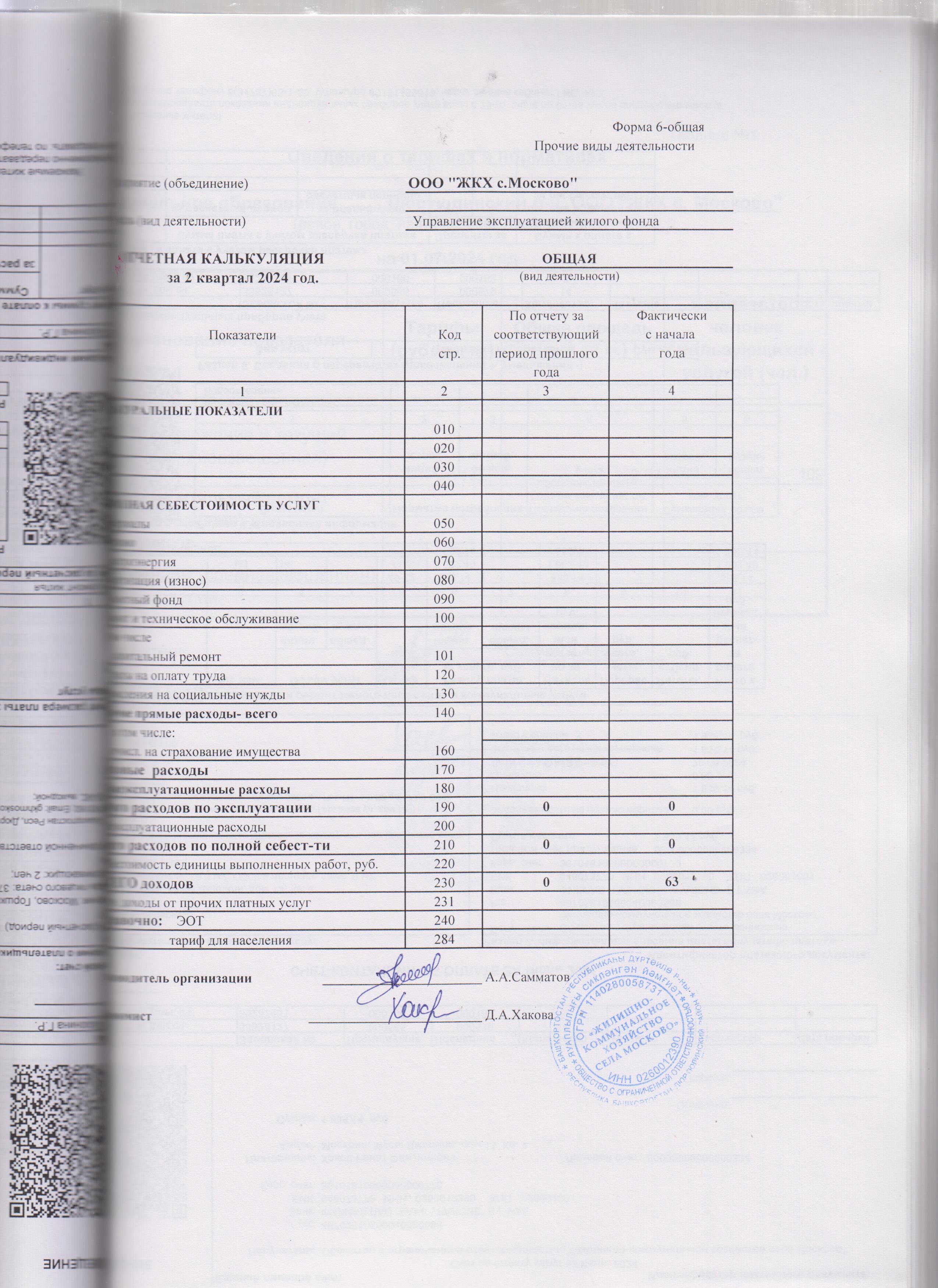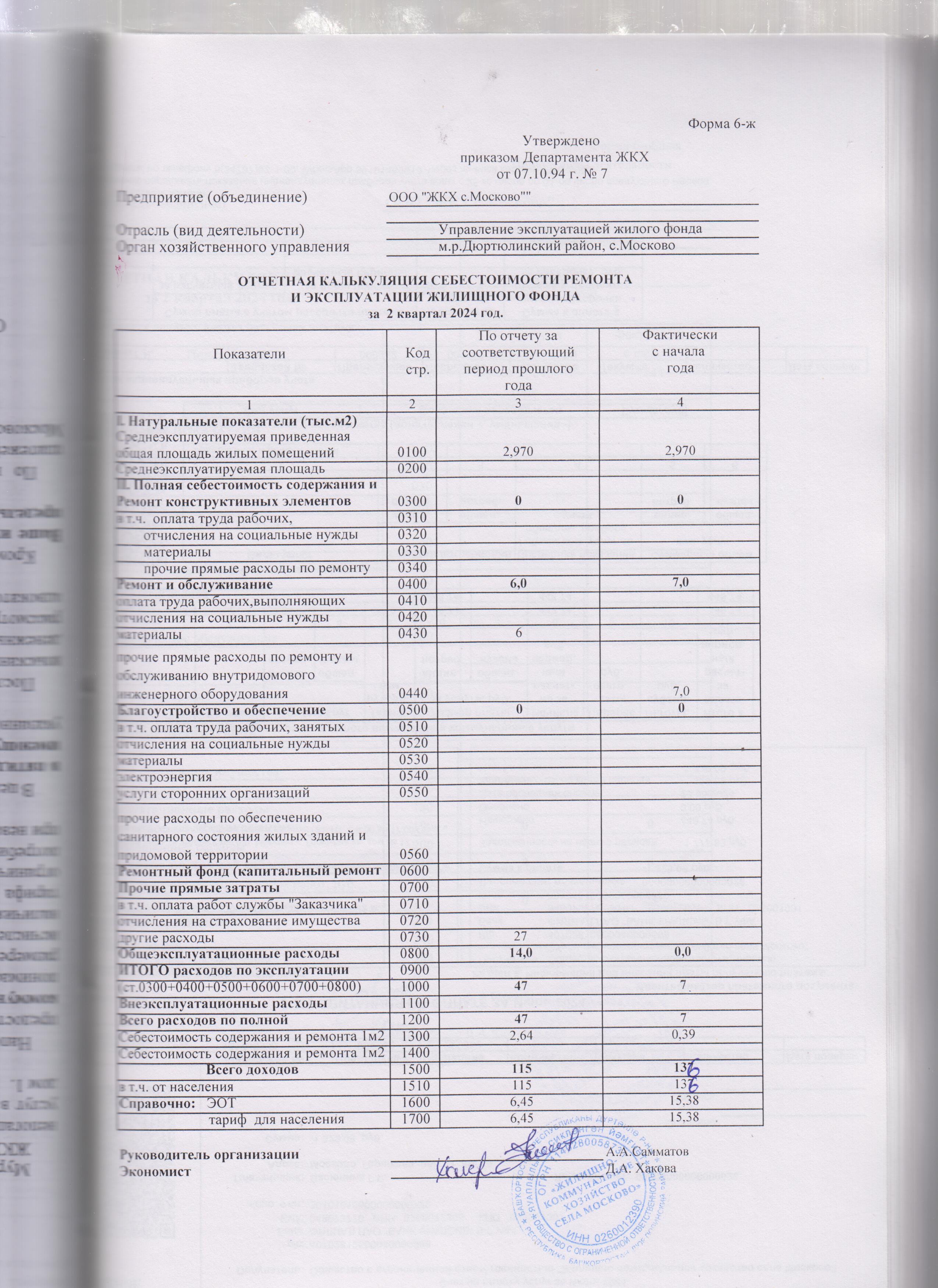 Отчетная калькуляция себестоимости ремонта и эксплуатации жилищного фонда за 2 квартал