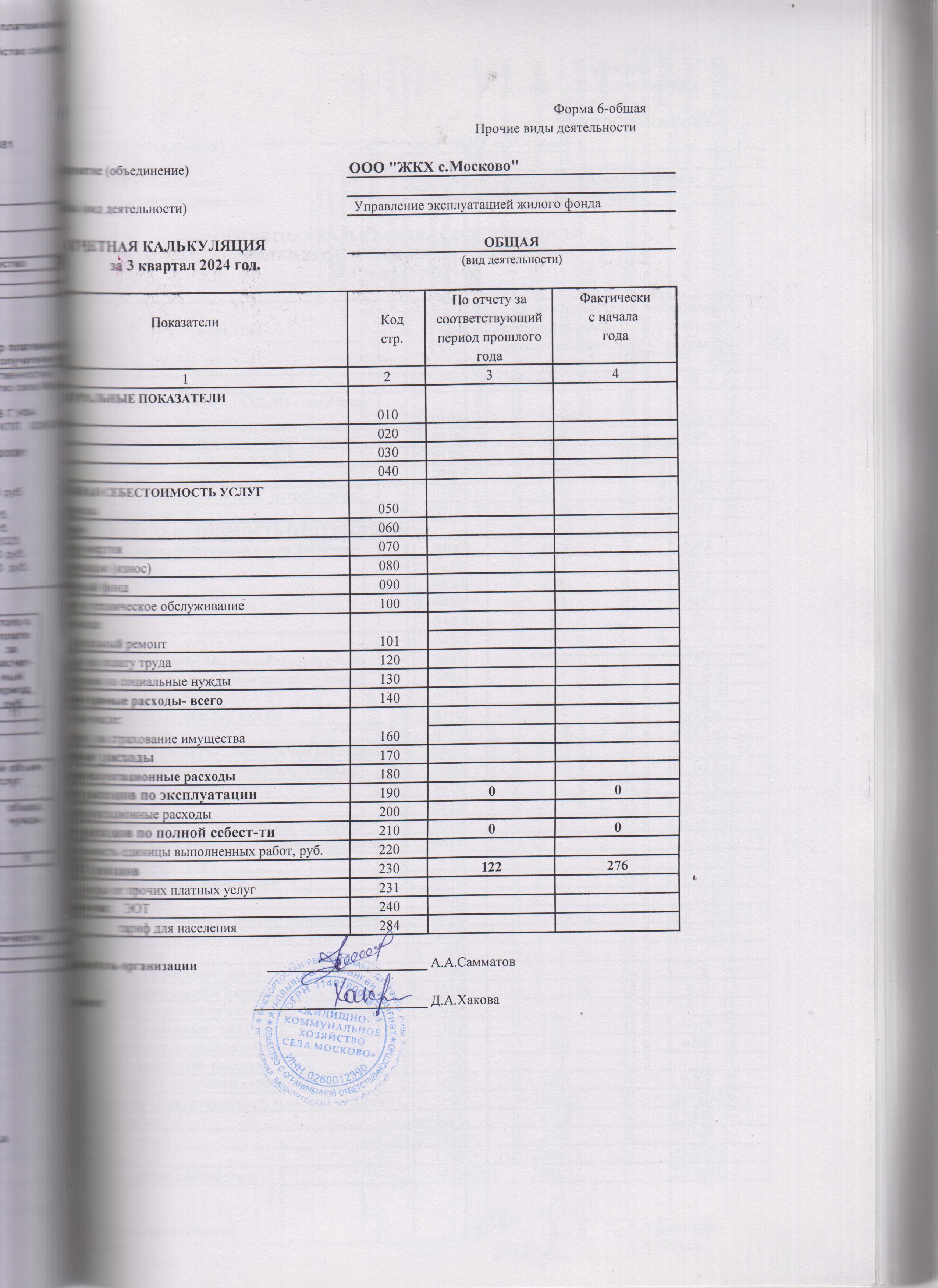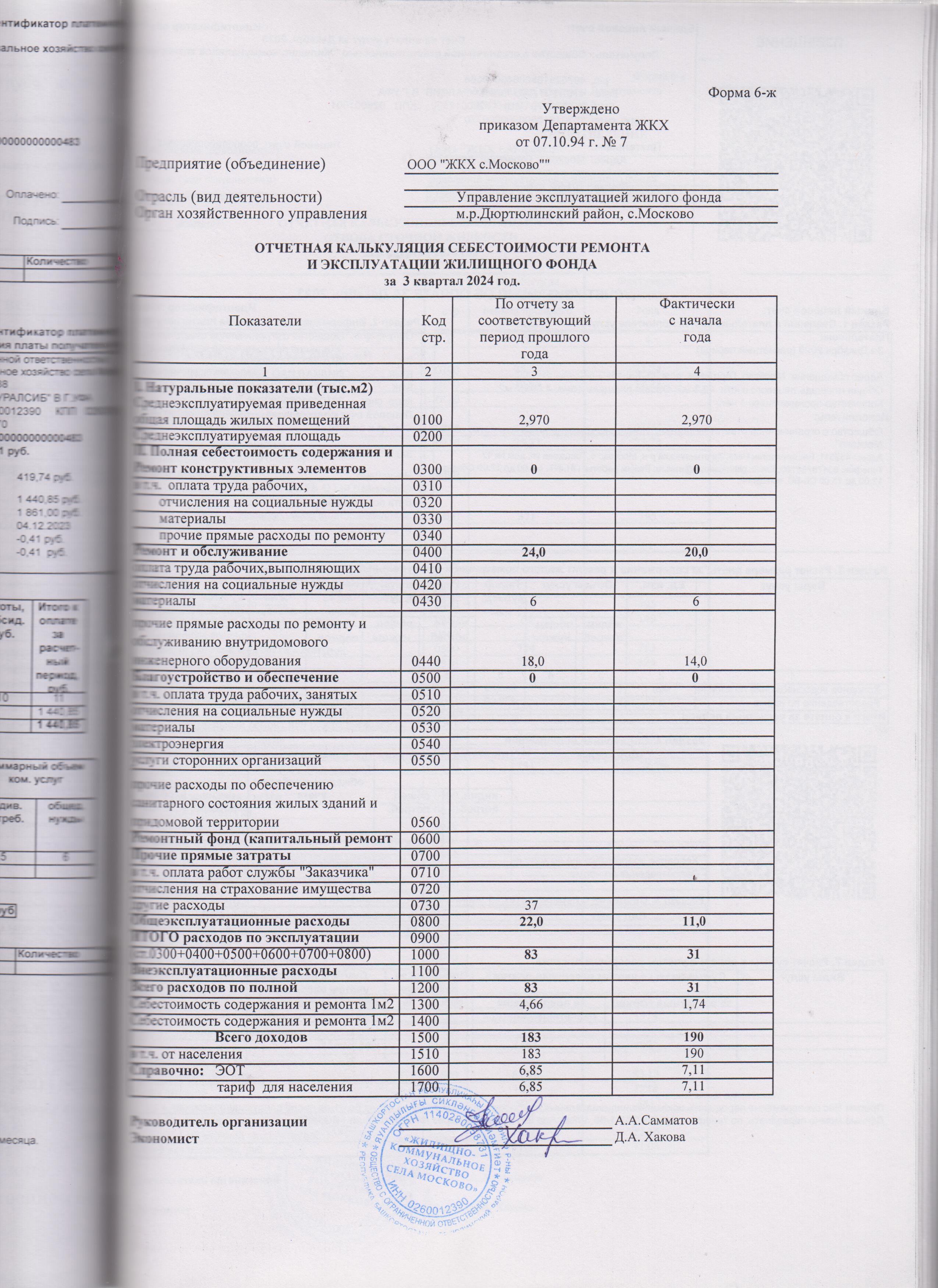 Отчетная калькуляция себестоимости ремонта и эксплуатации жилищного фонда за 3 квартал