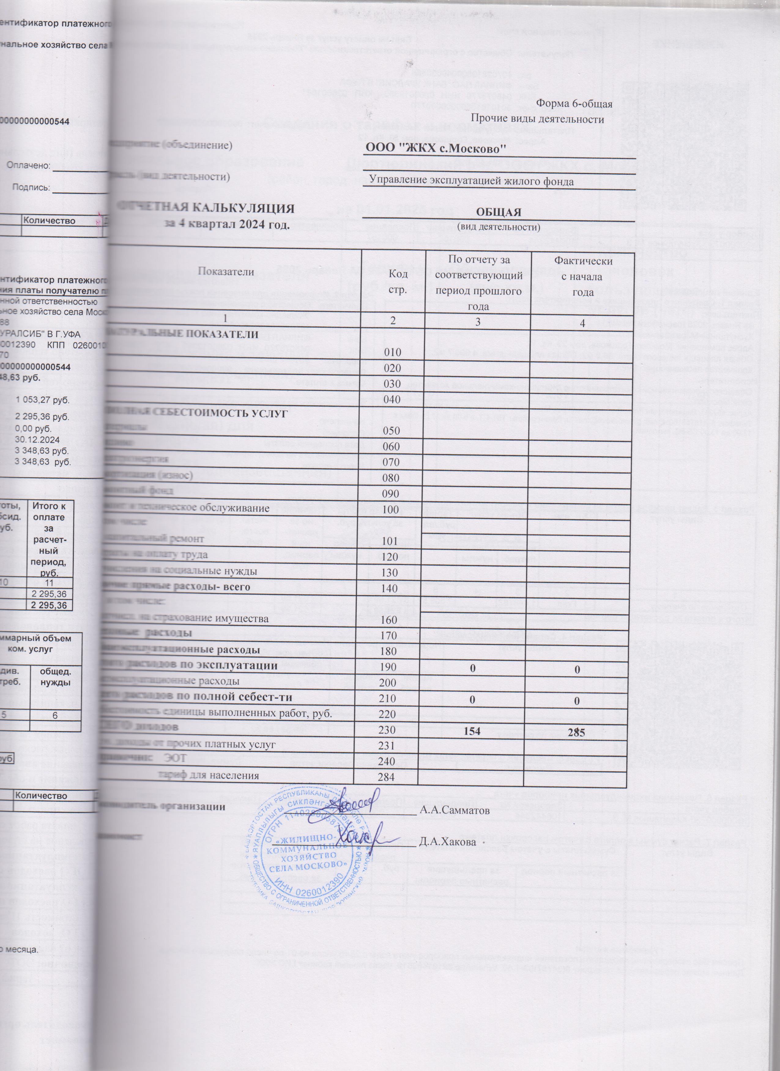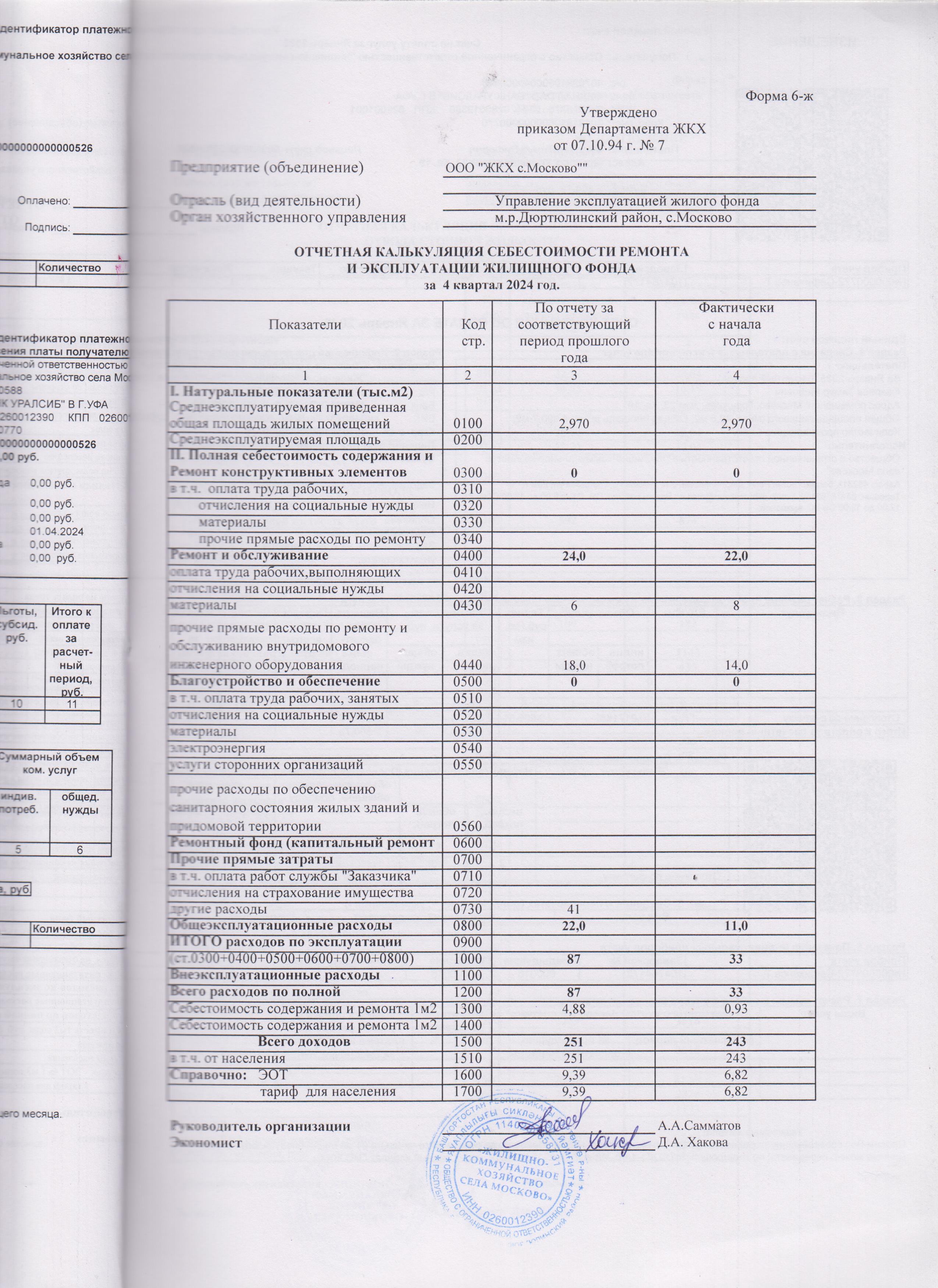 Отчетная калькуляция себестоимости ремонта и эксплуатации жилищного фонда за 4 квартал
