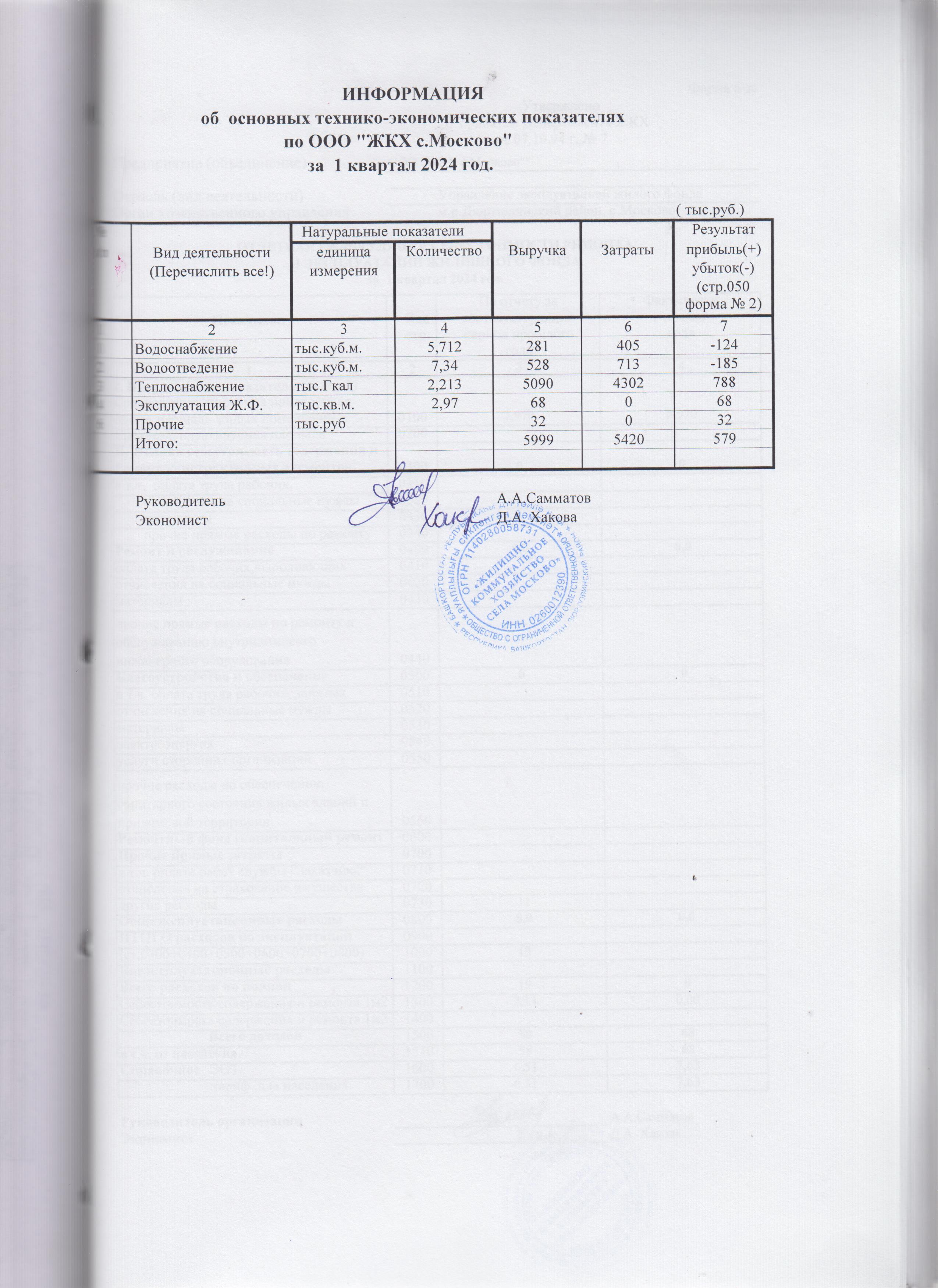 Информация об основных технико-экономических показателях за 1 квартал