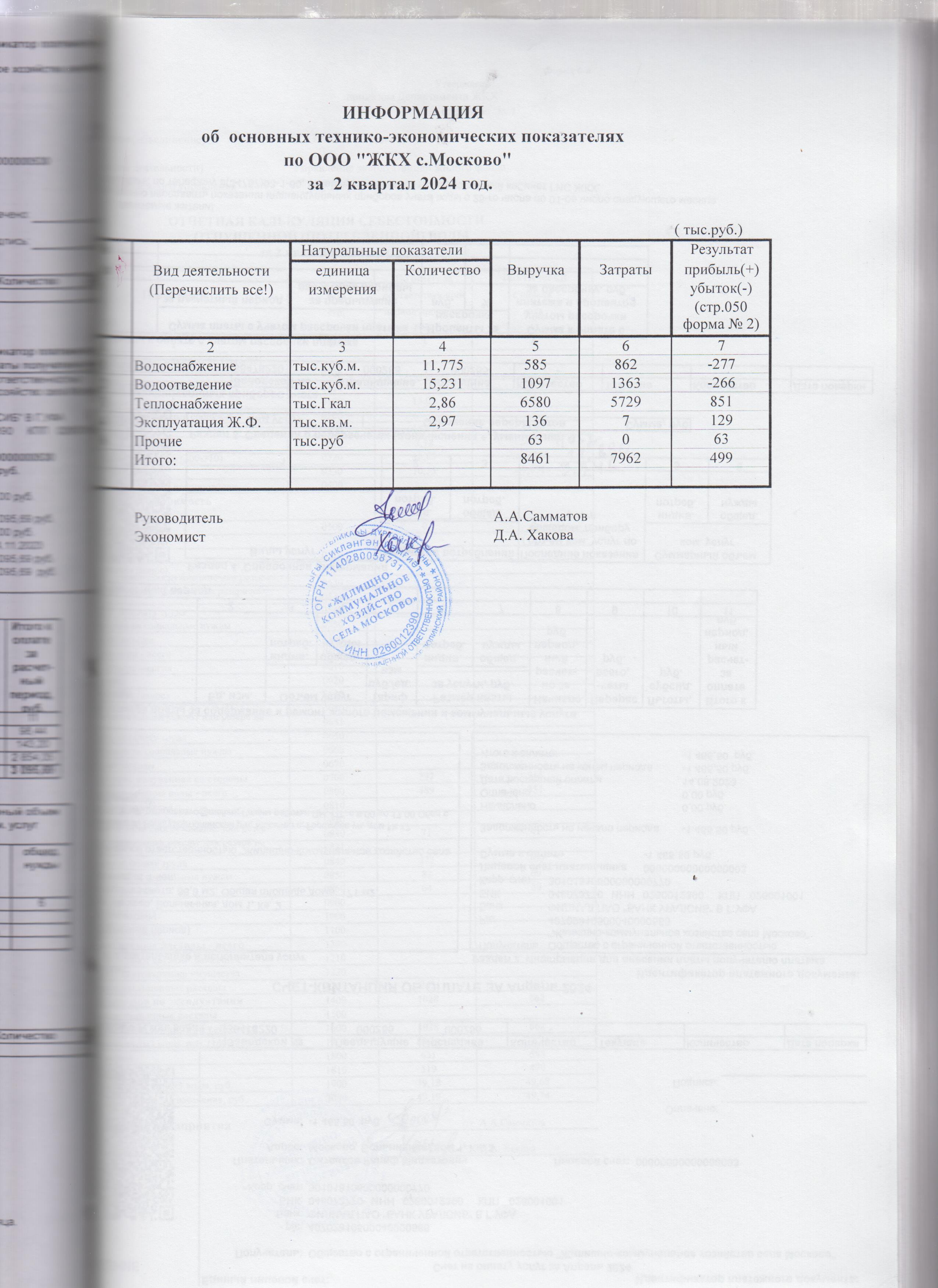 Информация об основных технико-экономических показателях за 2 квартал