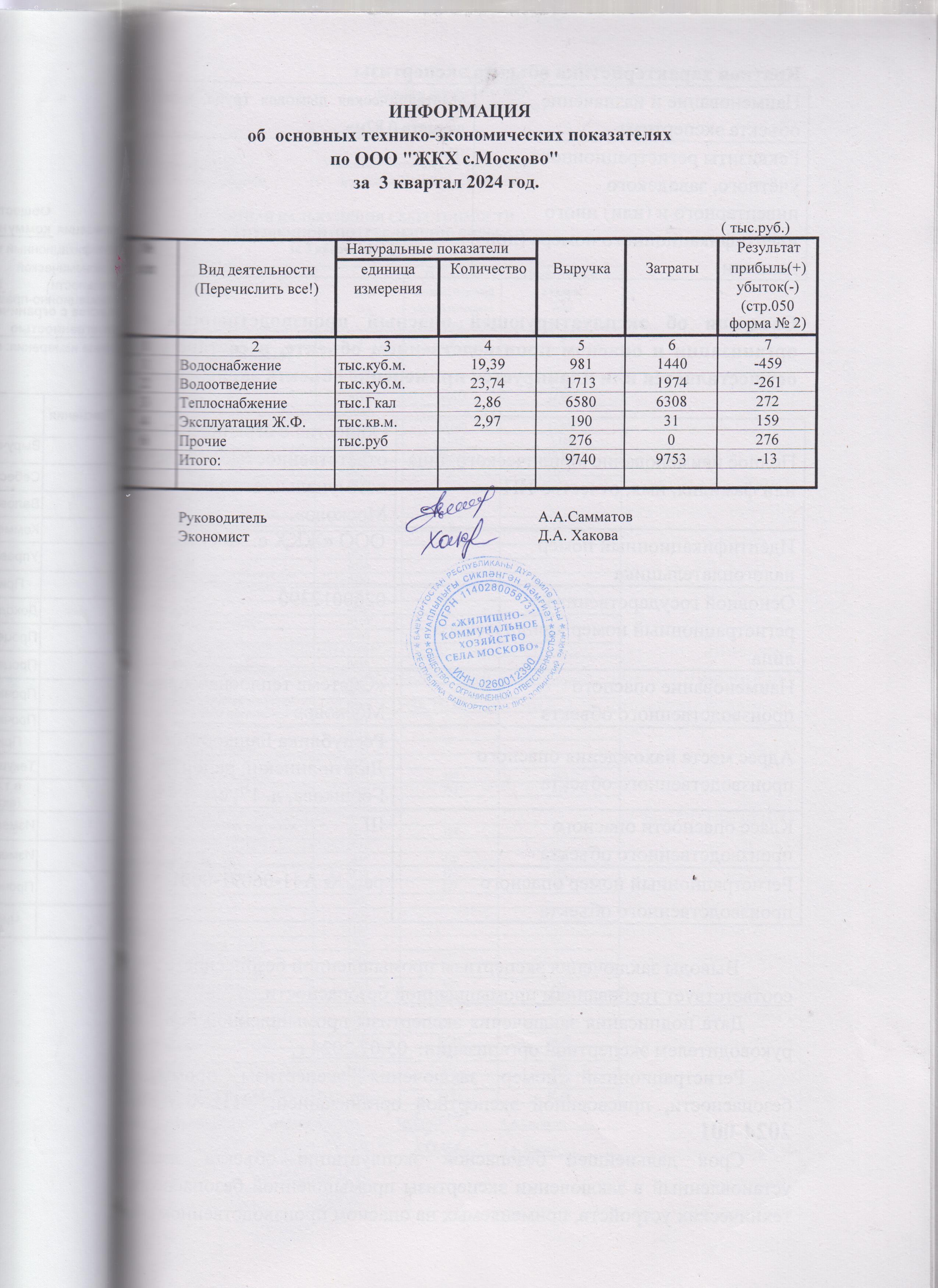 Информация об основных технико-экономических показателях за 3 квартал