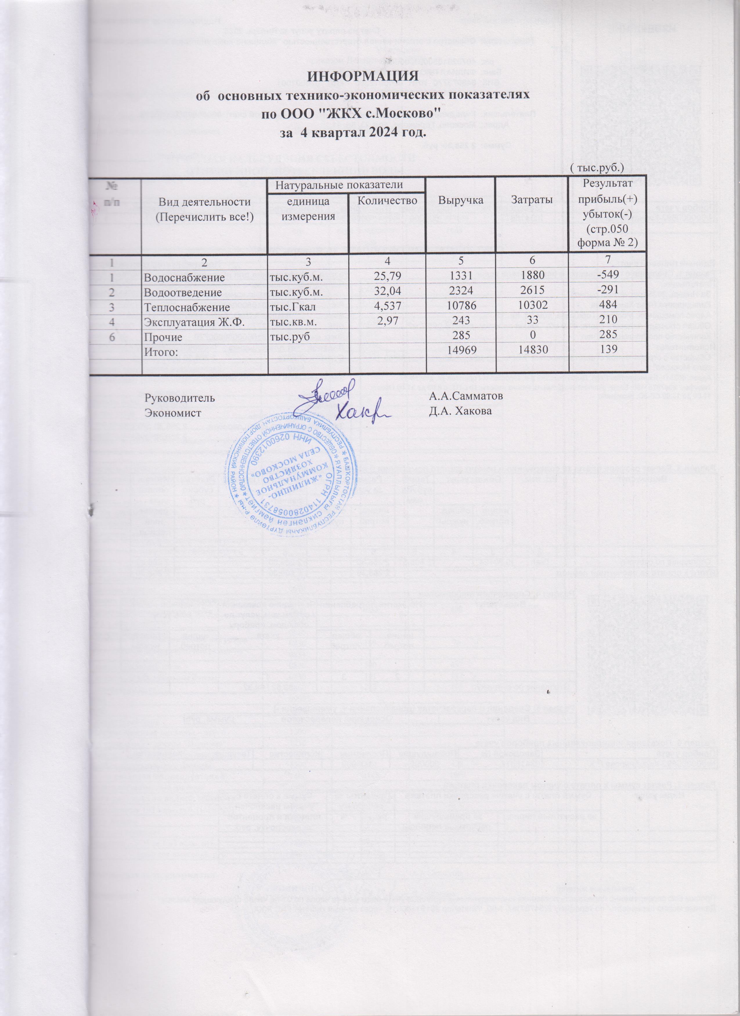 Информация об основных технико-экономических показателях за 4 квартал
