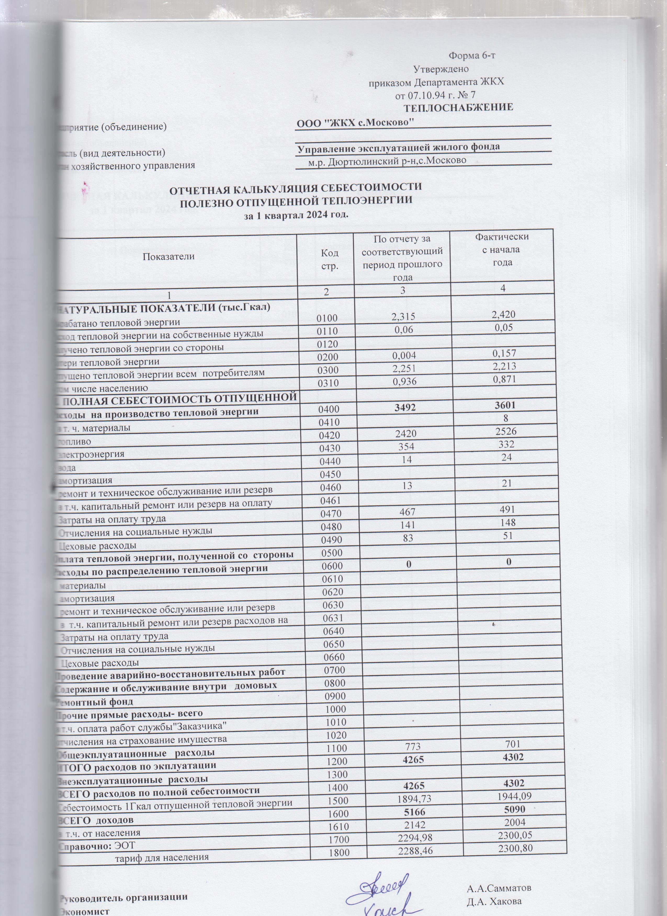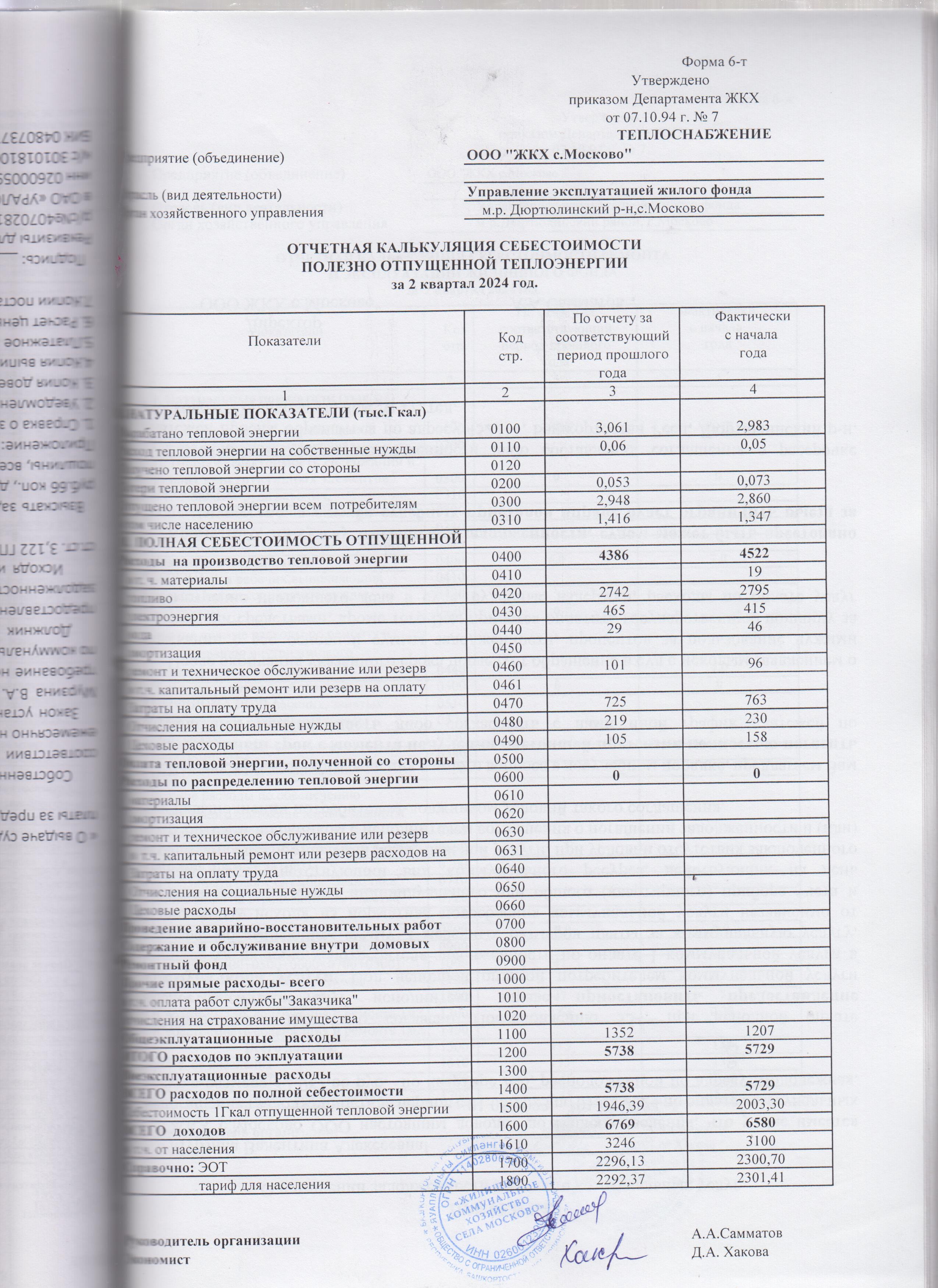 Отчетная калькуляция себестоимости полезно отпущенной тепловой энергии за 2 квартал