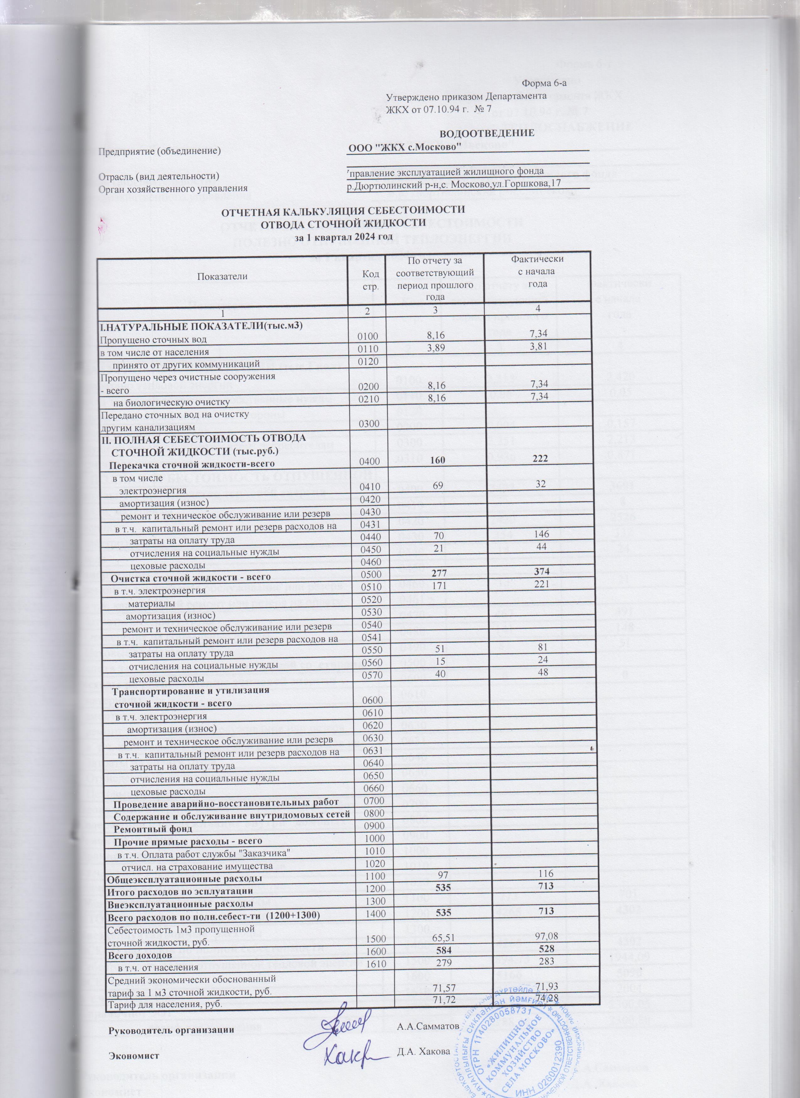Отчетная калькуляция себестоимости сточной жидкости за 1 квартал