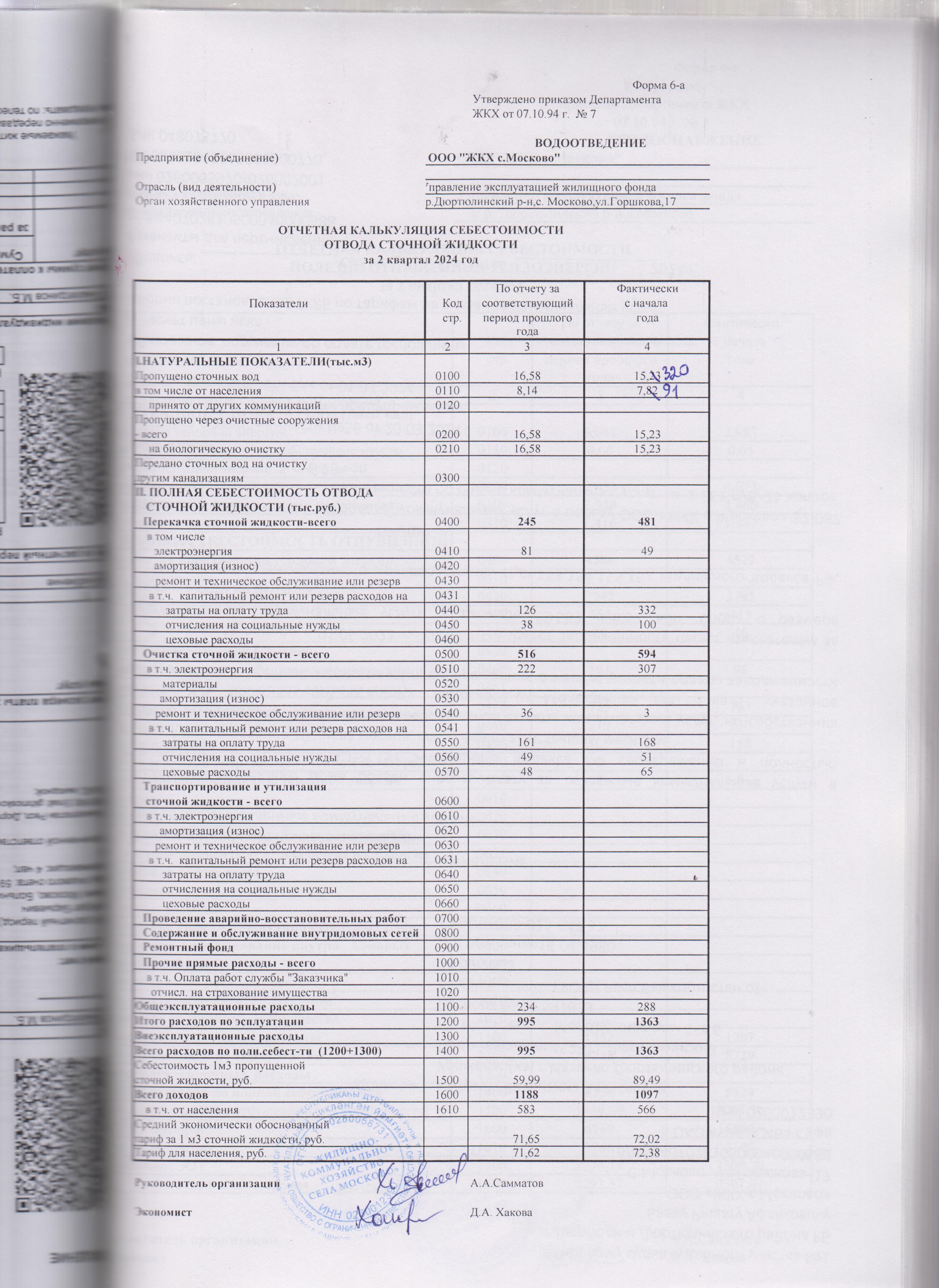 Отчетная калькуляция себестоимости сточной жидкости за 2 квартал