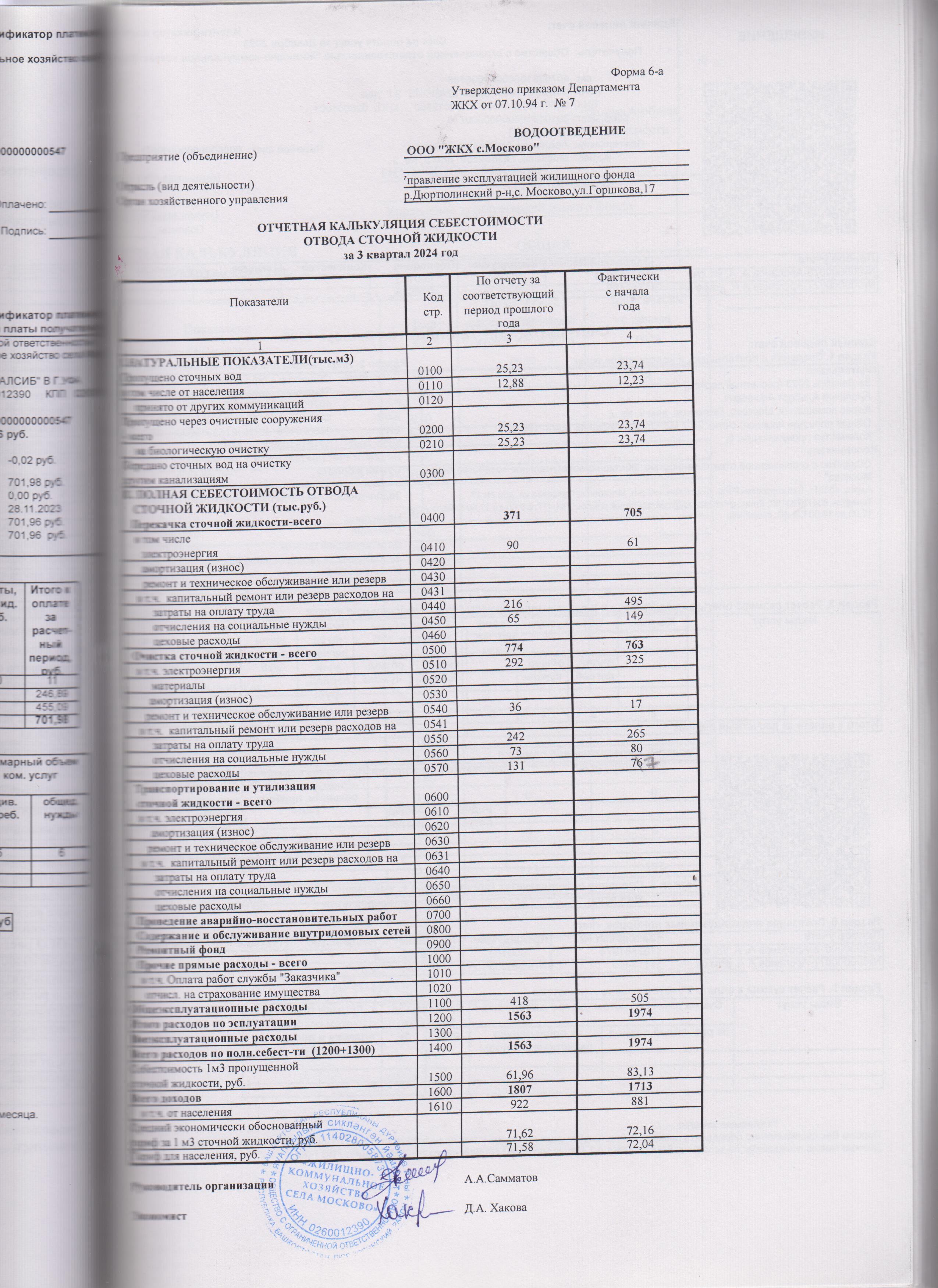 Отчетная калькуляция себестоимости сточной жидкости за 3 квартал