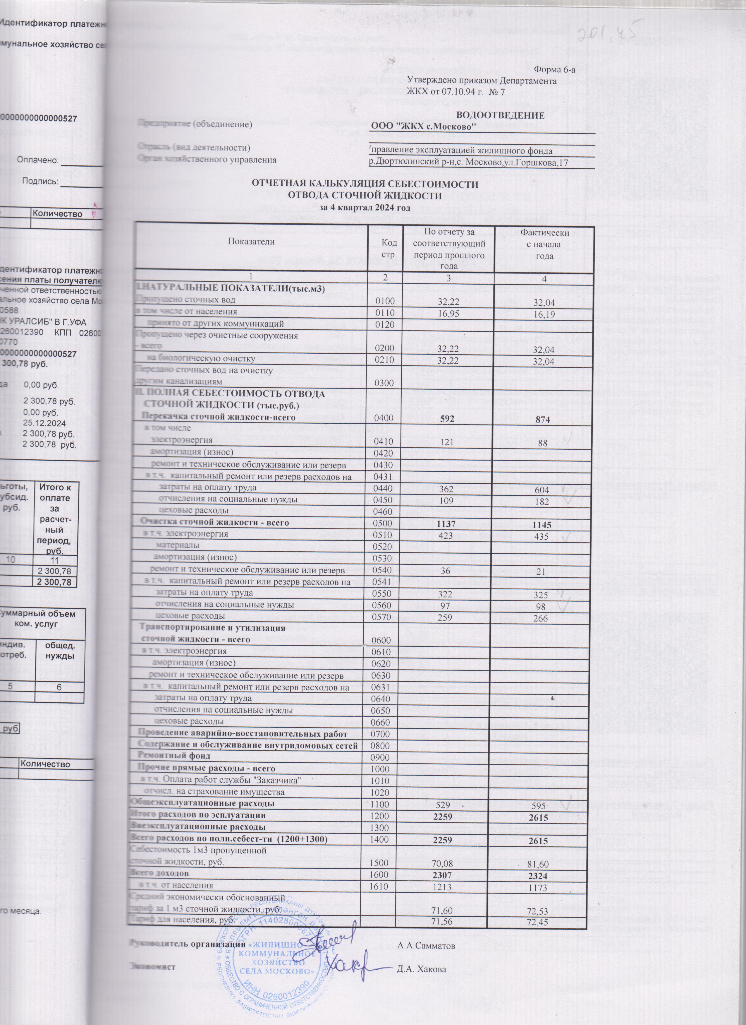 Отчетная калькуляция себестоимости сточной жидкости за 4 квартал