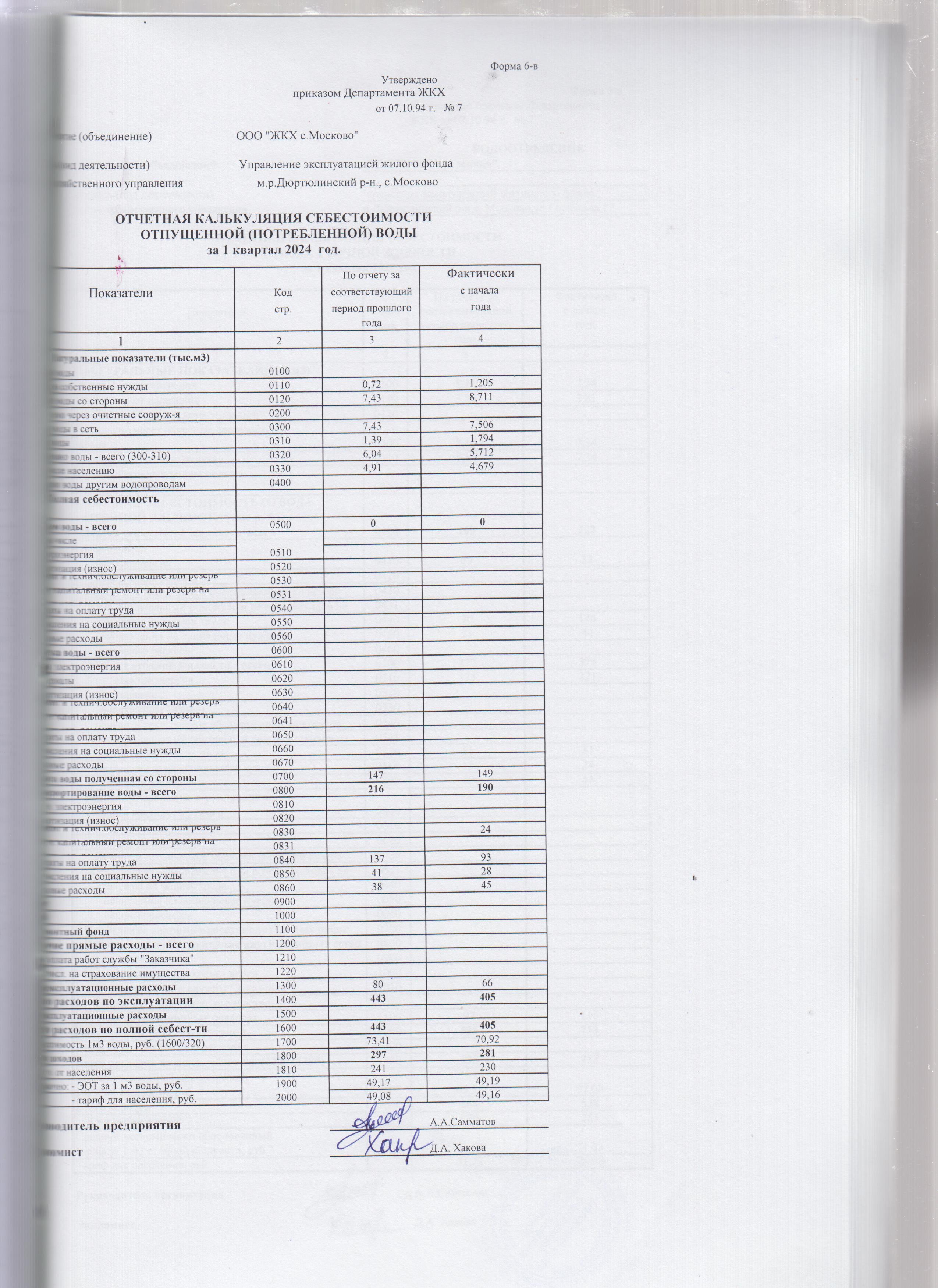 Отчетная калькуляция отпущенной воды за 1 квартал