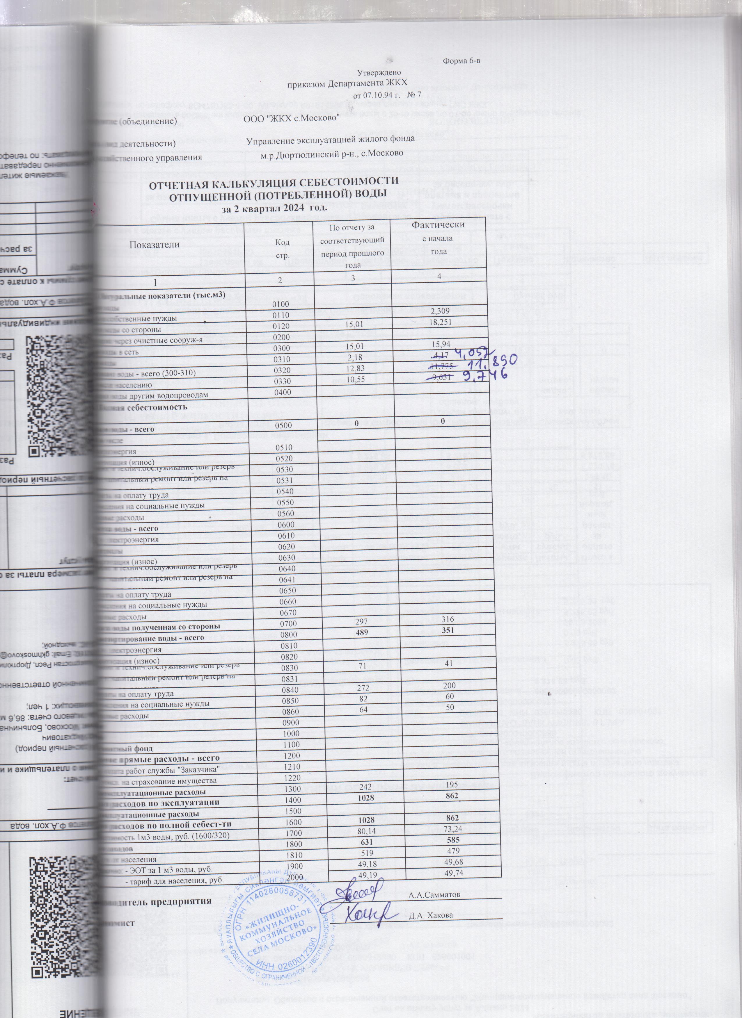 Отчетная калькуляция отпущенной воды за 2 квартал