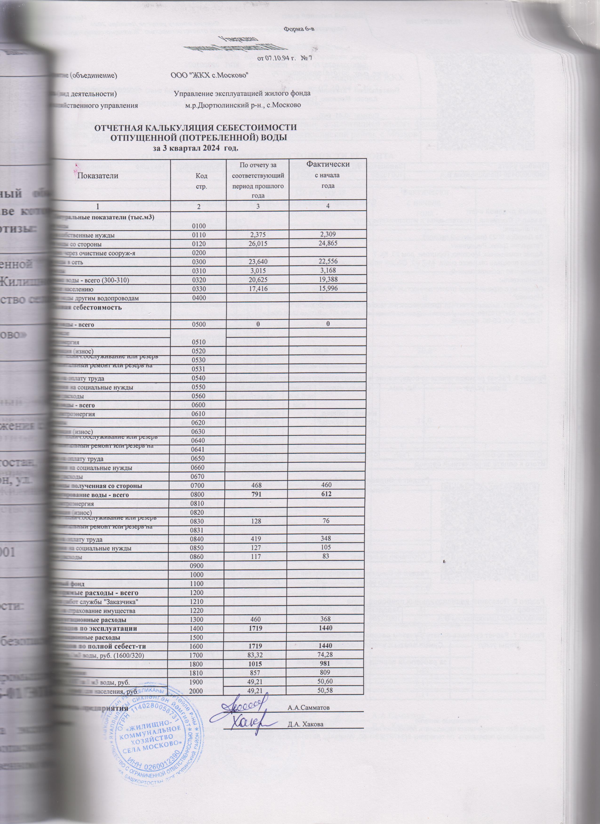 Отчетная калькуляция отпущенной воды за 3 квартал