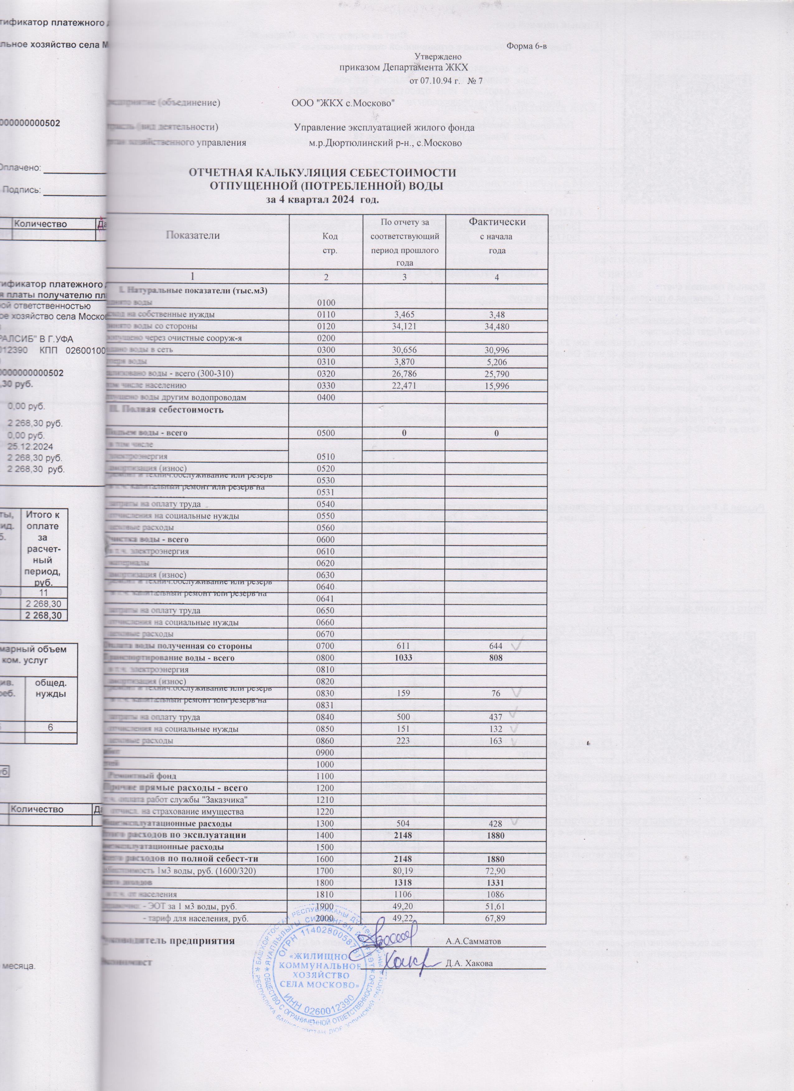 Отчетная калькуляция отпущенной воды за 4 квартал